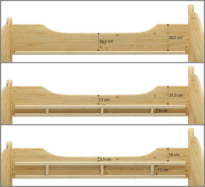 The bed comes with pre-drilled blocks (6-12 cm) to raise or lower the mattress level.