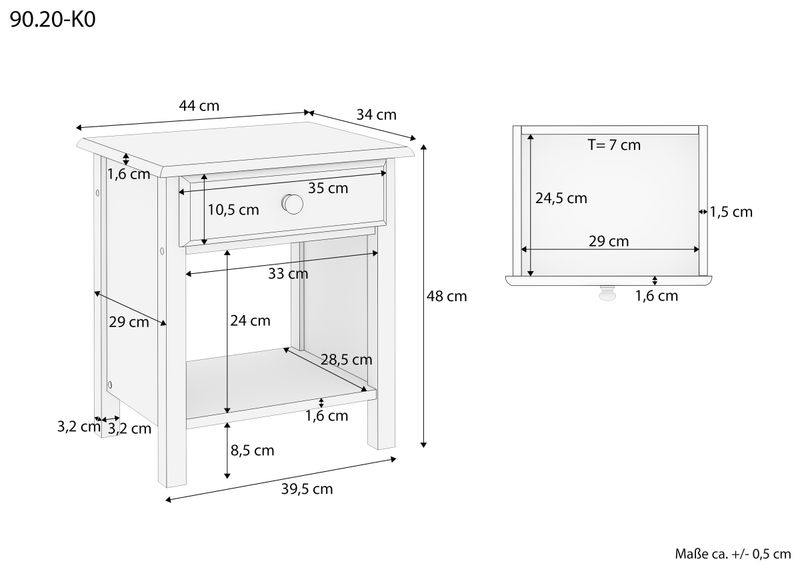 table de nuit avec 2 tiroirs et 1 niche pour des lits plus hauts 90.20-K3