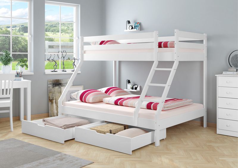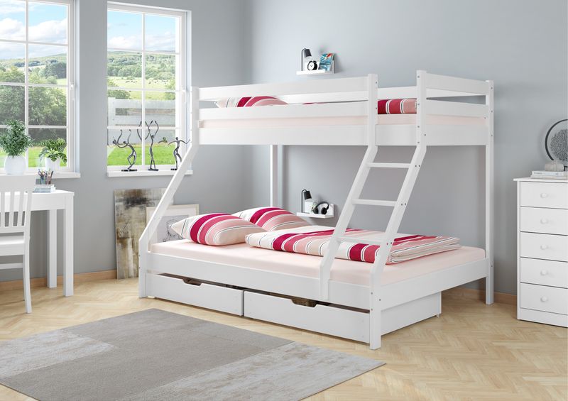 Un lit en pin massif peint en blanc avec 3 couchages et de nombreuses possibilités!