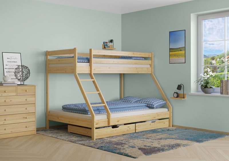 Lit double 140x200 avec lit simple superposé 90x200, pin naturel, divers accessoires V-60.19-09-14