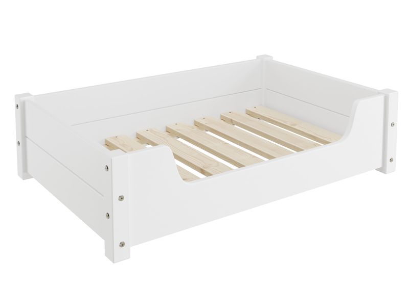 Le cadre de lit est fabriqué en pin massif, qui a été peint en blanc. Tous les vernis sont à base d'eau, donc très sains pour l'habitat et la belle haptique de la surface du bois est préservée. Le bois provient