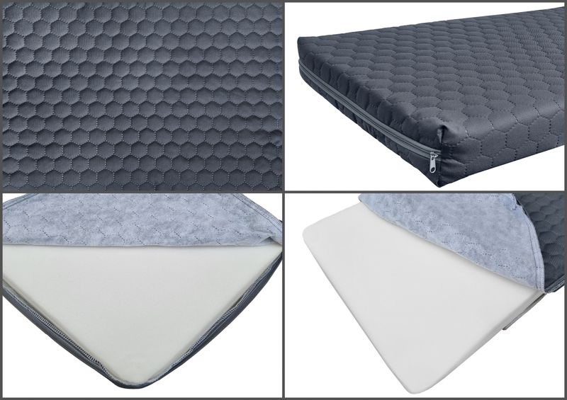 Le matelas est en mousse (mousse de confort), recouvert d'une housse en polyester matelassée et rembourrée, avec fermeture éclair sur 3 côtés, afin qu'elle soit amovible et lavable.