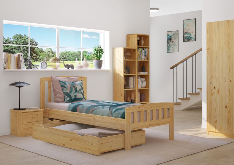 V-60.57-09 Lit simple classique en pin massif naturel avec tête et pied de lit, surface de couchage 90x200 cm, grand choix d'accessoires