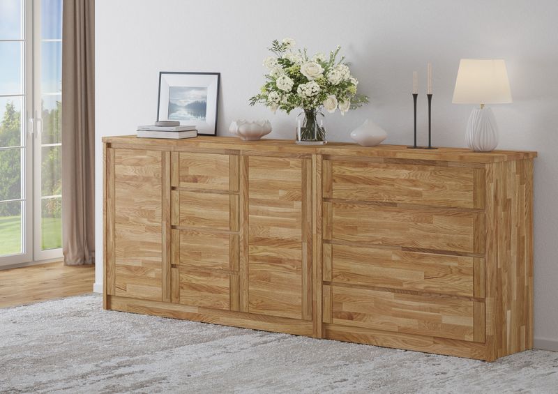 Ce sideboard en bois peut être utilisé partout où l'espace de rangement manque - dans le salon, la chambre à coucher ou le couloir.