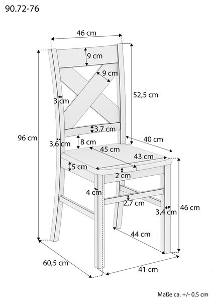 Hauteur de la chaise avec les pieds, l'assise et le dossier : env. 85 cm