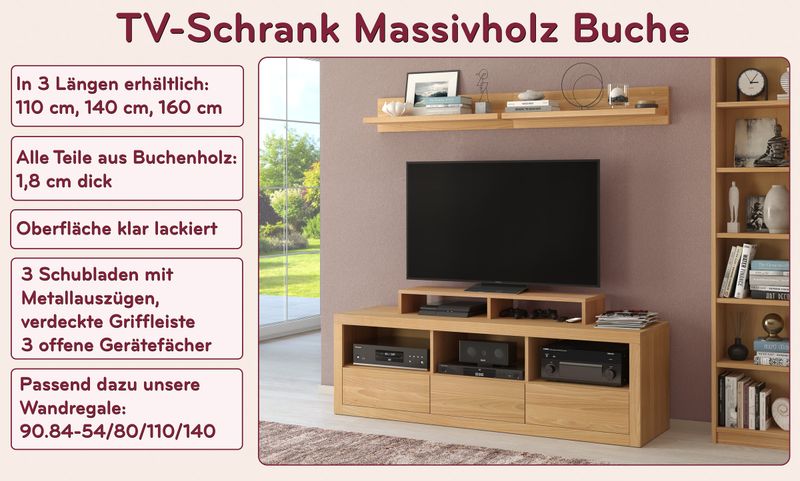 90.51-14 Armoire TV Meuble multimédia Buffet bas en bois hêtre naturel