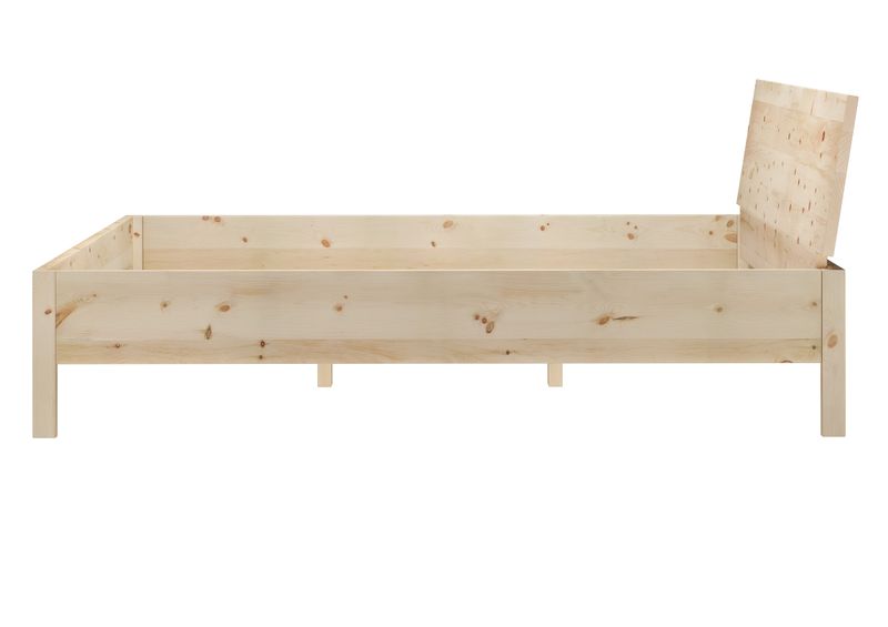 Das Bett besticht durch seine metallfreie Konstruktion, bei dem der gesamte Rahmen und das leicht geneigte Kopfteil fest durch stabile Zapfenverbindungen zusammengefügt sind.