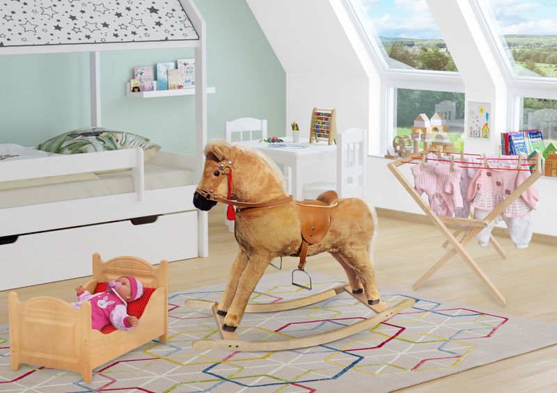 Niedliches Schaukelpferd, das einem Haflinger Pferd ähnlich sieht. Das wird der neue Star im Kinderzimmer.