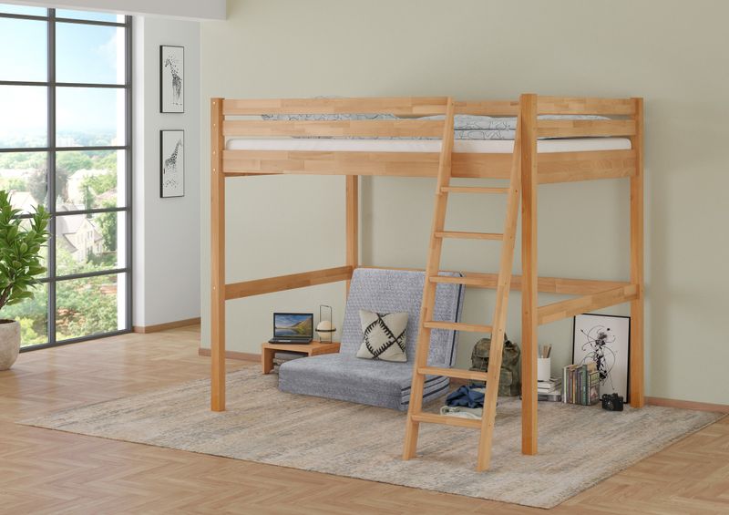 Con questo letto a soppalco in faggio massello recuperate spazio prezioso senza rinunciare a un’ampia superficie di riposo di 140x200 cm.
