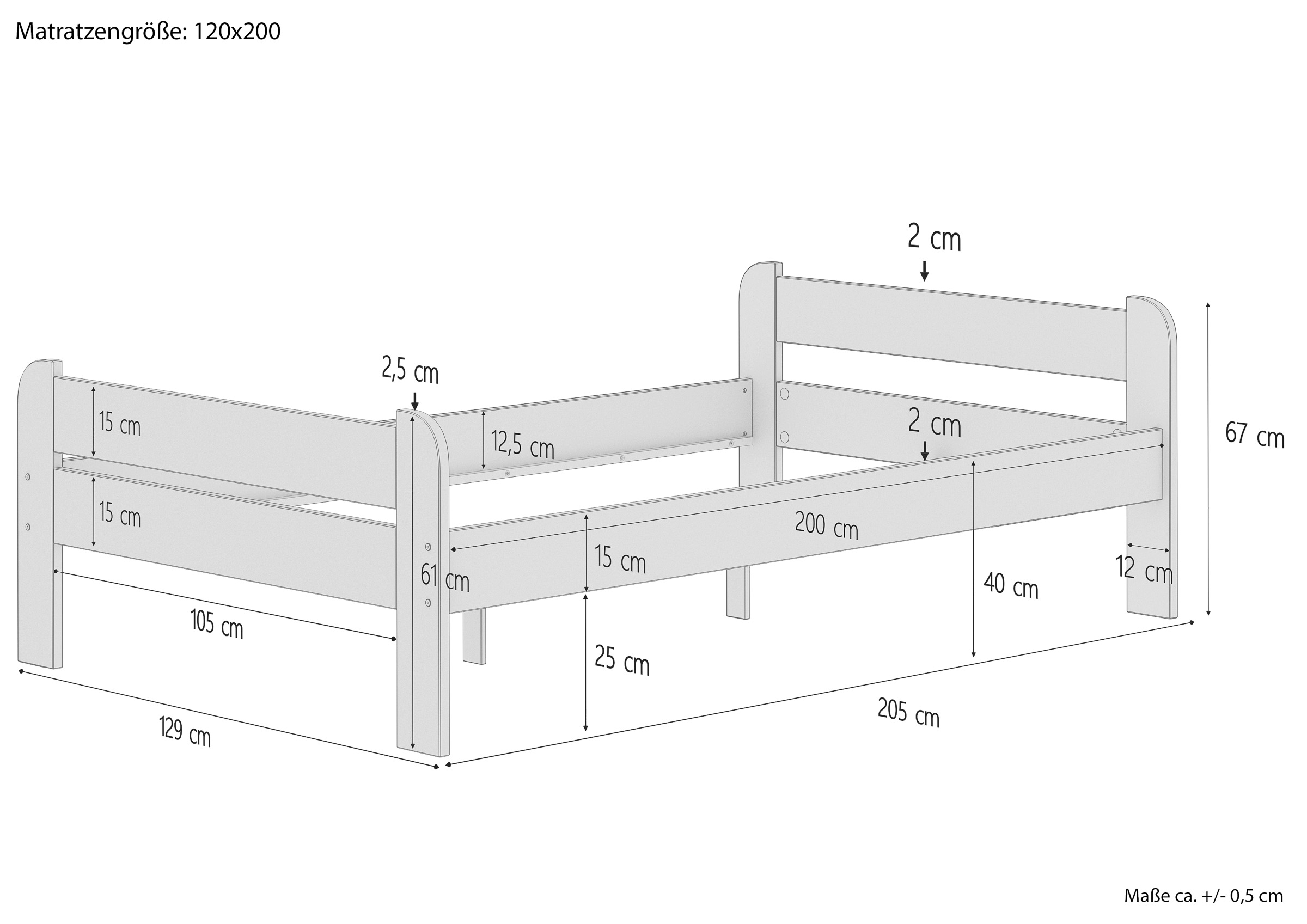 Außenmaße des gesamten Bettes: ca. 129 x 205 cm (B/L)