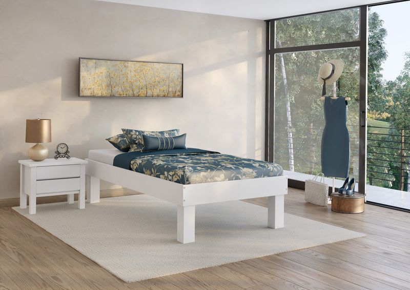 Das Bettgestell besteht aus massivem Buchenholz, das für eine glatte Haptik fein geschliffen und anschließend dezent waschweiß gefärbt wurde.