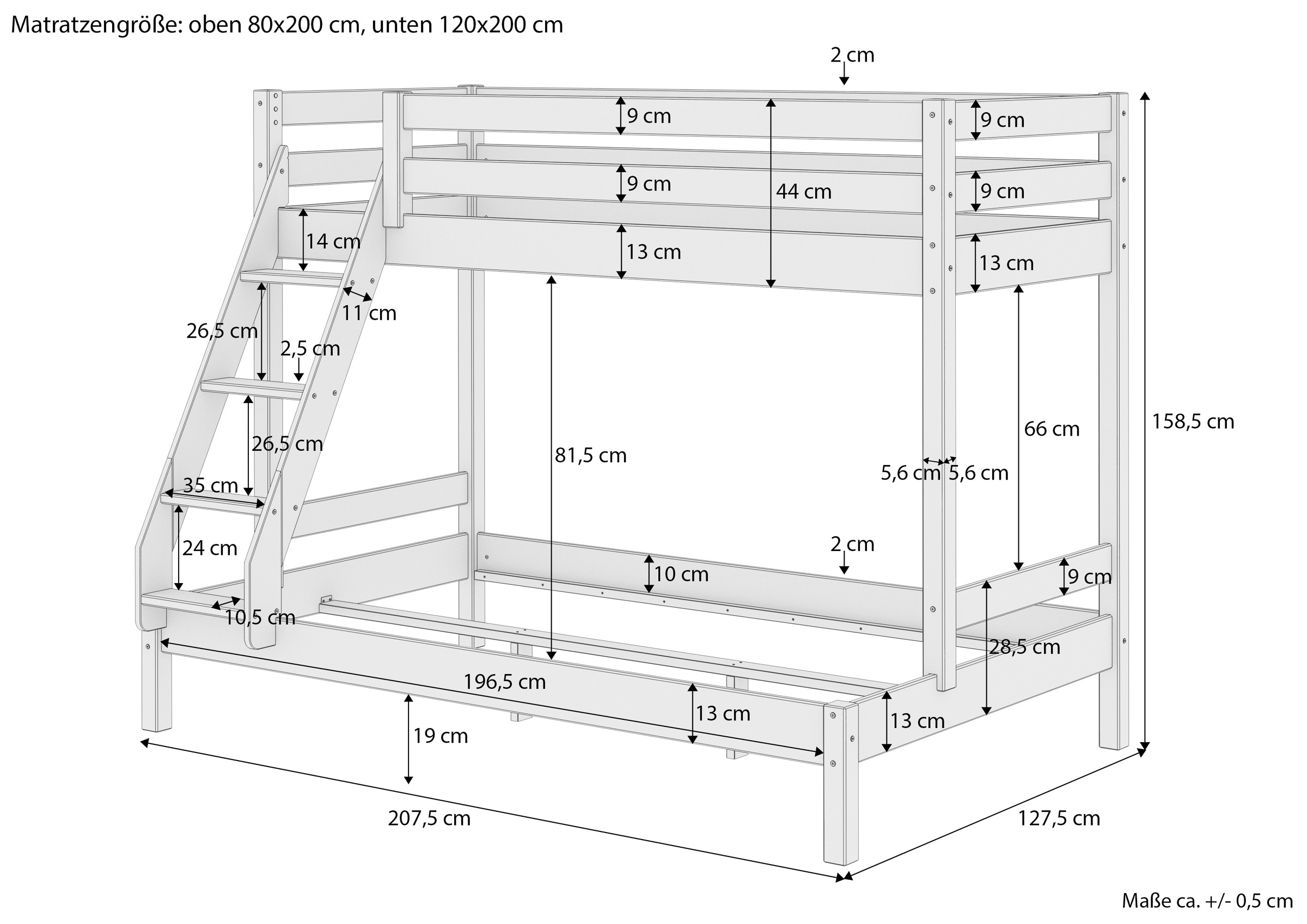 Liegefläche unten: 120x200 cm (mit Mittelleiste und Bodenstützen)