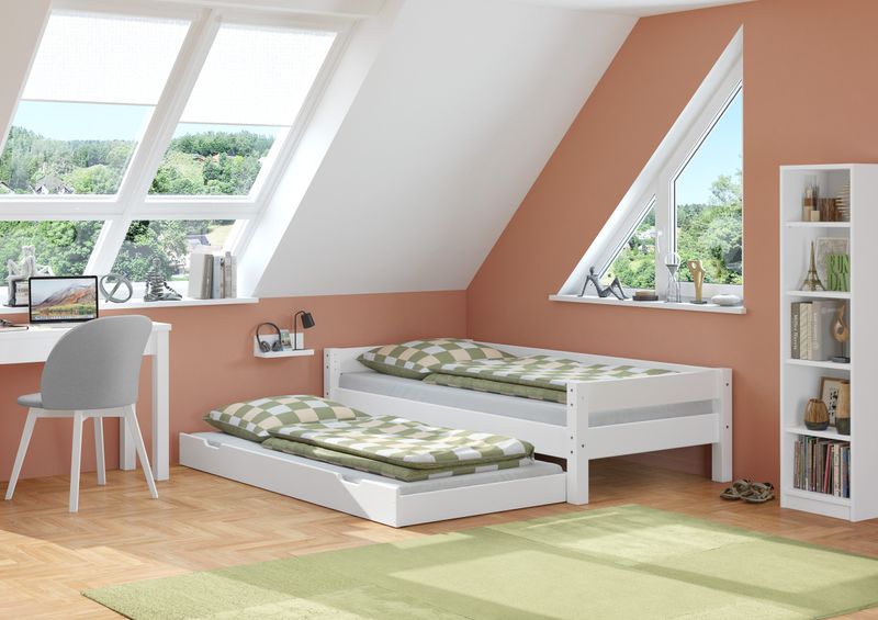 Unser Einzelbett aus hochwertigem Kiefernholz, das sich leicht in ein Hochbett erweitern lässt.