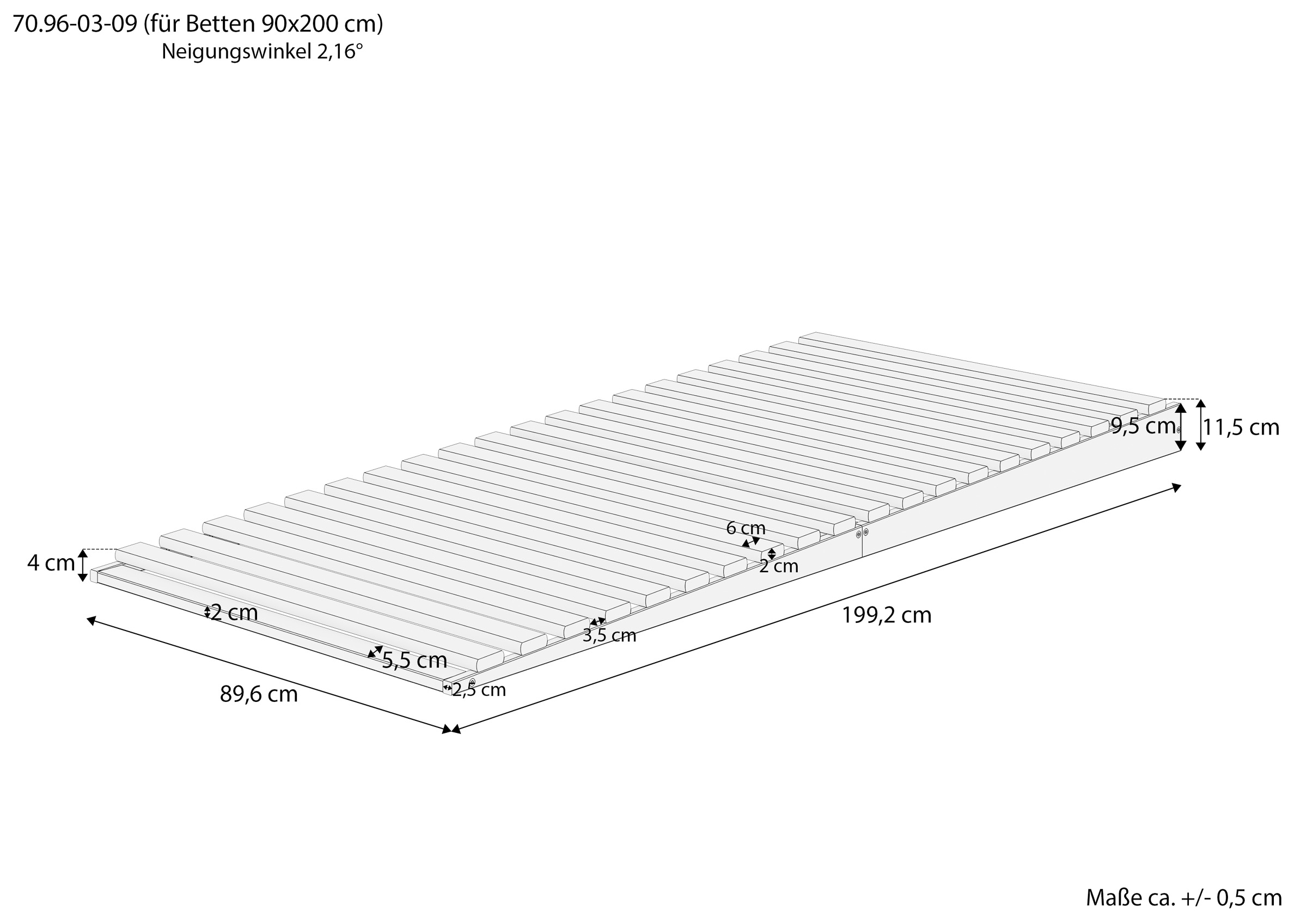 Nach dem Aufbau entsteht eine stabile, schiefe Ebene: Das Kopfende misst ca. 11,5 cm, das Fußende ca. 4 cm – eine Höhendifferenz von 7,5 cm. Daraus ergibt sich ein idealer Neigungswinkel von ca. 2,16°. Der Rahmen wird wie ein gewöhnlicher Lattenrost verwendet: Matratze direkt darauflegen, fertig.