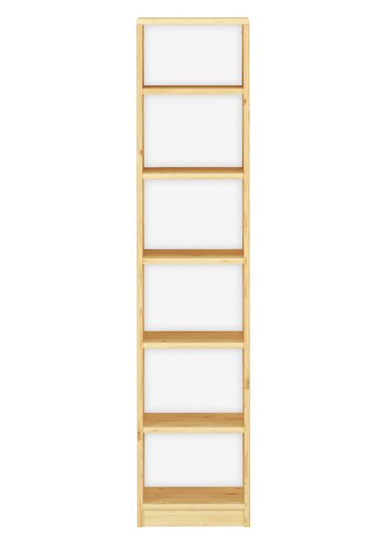 Dieses Bücherregal aus massiver Kiefer bietet flexible Ablageflächen für Bücher, CDs, DVDs oder kleine Dekorationen. Die stabile Konstruktion sorgt für sicheren Stand, die fein geschliffenen Oberflächen unterstreichen die natürliche Holzoptik. Die Rückwand ist weiß lackiert, Seiten und Böden sind naturbelassen oder klar lackiert.