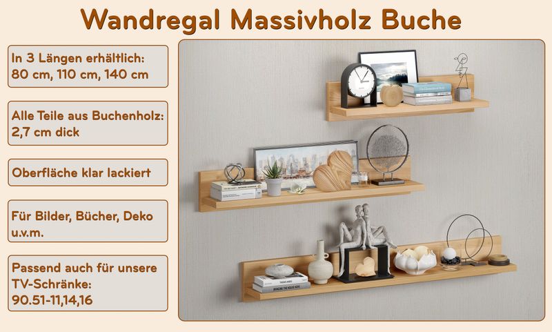 Elegantes Holzregal Wandregal aus Buche B-WARE-90.84-54-140 Wählbare Länge: 80 cm, 110 cm, 140 cm