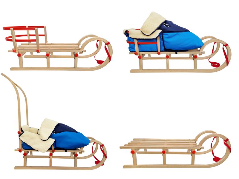 An den Hörnerbögen kann man sich gut festhalten, wenn man den Berg hinab saust. Die kräftigen Klappscharniere und die handlichen Schraubräder sind sehr robust und lassen sich auch mit Handschuhen noch gut bedienen. Im Sommer praktisch und platzsparend aufgeräumt und im Winter mit wenig Platz im Kofferraum des Autos verstaut. So kann man auch mehrere Schlitten für die ganze Familie transportieren.